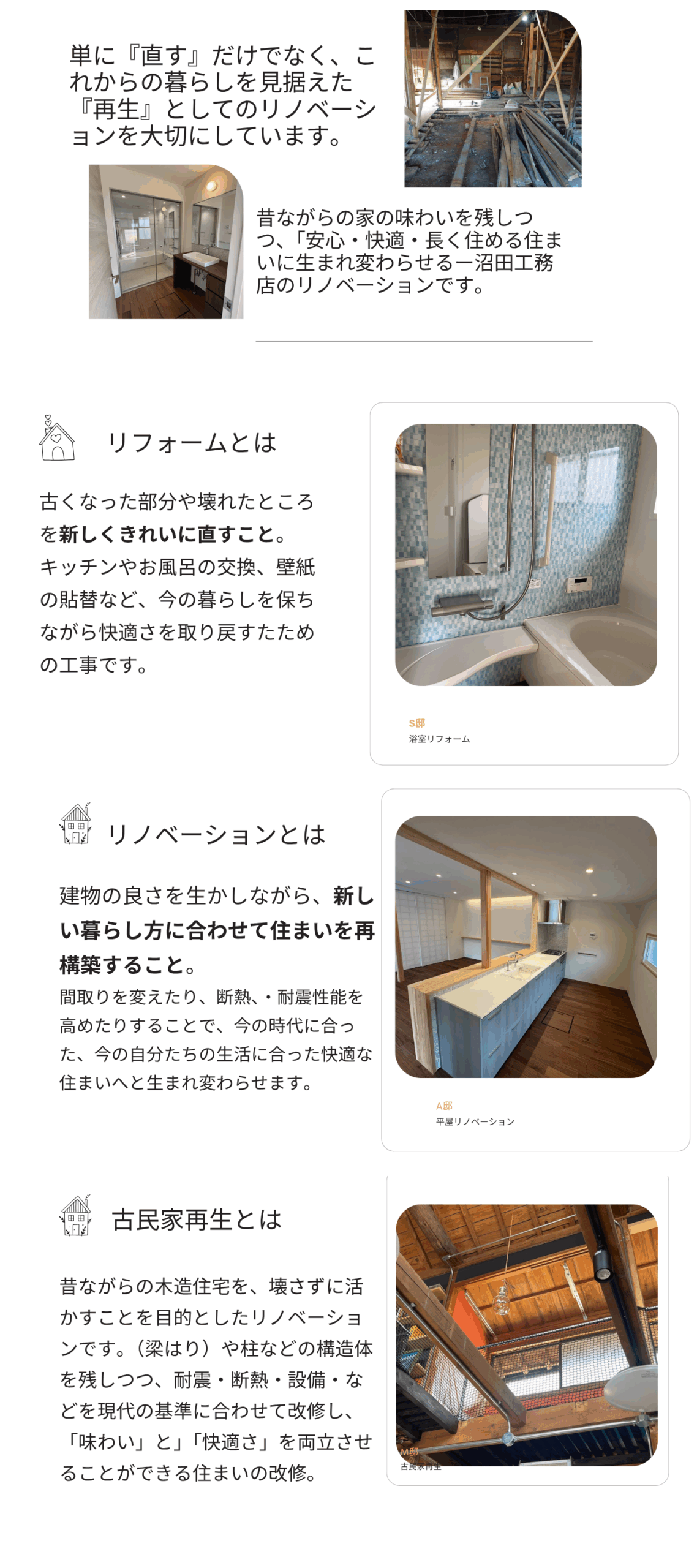 既存の基礎や柱、構造部材を活かし、ストレスなく快適に暮らせるリノベーションのご提案、もちろん省エネにも配慮し、断熱で暖かく健康に暮らせるお家づくりをさせていただきます。